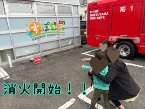 消火訓練はスタッフも子どもたちも体験させていただいて、消火器の使い方等もたくさんお話が聞けました。